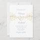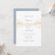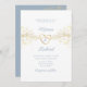 Simples e elegante roteiro de caligrafia manuscrito, convite de casamento azul empoeirado boêmico com coração de corda de ouro e rendas florais douradas.