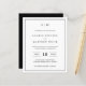 Simples convite de casamento orçamentário com um design moderno, mas elegante, com seu monograma de duas letras no topo, um layout ousado de data e seus detalhes cercados por uma borda fina. Todos os elementos de design estão em preto-e-branco e podem ser alterados na ferramenta de edição de design. Um design chic e na moda que é excelente para um casal minimalista.