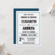 Simples convite de casamento moderno. Negrito, preto e branco. Destaques da borda azul e parte de trás do convite.