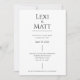 Faça uma declaração de eterno com este simples convite de casamento preto e branco. Apresentando uma tipografia limpa e um layout minimalista, este convite moderno é perfeito para casais que amam uma estética elegante e sem confusão. A paleta de cores clássica e o trabalho de estilo refinado são lindos para casamentos formais, lugares de galeria ou comemorações de cidades quicas. Personalize com seus detalhes de casamento para uma aparência que é facilmente sofisticada.