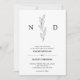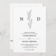 Convite de casamento minimalista preto e branco, com suas iniciais monogramadas e folhas botânicas ilustradas à mão no topo