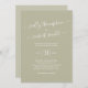 Esta design apresenta uma cor verde simples, elegante e sábio com roteiro caligráfico, tendências, textos formais e inscrições, com uma tipografia moderna e mínima de data de casamento