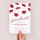 Convites de festa de formatura minimalistas com bonés vermelhos caindo e um modelo de texto moderno que é fácil de personalizar.