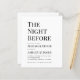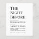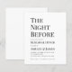 Um convite simples e minimalista de jantar de ensaios preto e branco. Tem apenas texto preto em fundo branco. O título "A Noite Anterior", a ocasião "Jantar de Ensaios" e o nome são escritos em letras maiúsculas maiores, o resto em letras minúsculas. O texto está alinhado à esquerda.