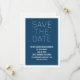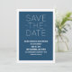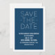 Anúncio Simples de Salvar a Data em azul escuro e branco com um design de tipografia moderna. Este convite para salvar a data é moderno e elegante, e fácil de personalizar com os detalhes do seu casamento. Para mais opções de personalização, clique no botão Personalizar.