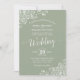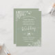 Este belo convite para o casamento apresenta um design simples, mas elegante, com uma caligrafia de escrita falada sobre um fundo verde sábio e um filigre floral friamente branco nos cantos. As cores são perfeitas para uma cerimônia de inverno.
