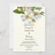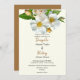 Uma foto excelente de rosas brancos selvagens com seus centros amarelos, folhas verdes e filhotes é colocada contra um fundo de marfim pálido para um convite de casamento maravilhoso com um leve toque nostálgico. A sugestão de um país um tanto ou quanto antigo inspirada na fotografia do rosa é atualizada com as fontes populares atuais para o texto do seu convite para o casamento. Os primeiros nomes do casal estão em uma fonte de script divertida em um marfim escuro, que foi recolhido para colorir as costas do cartão. A maior parte do texto encontra-se num "preto suave" e apresenta uma capitalização moderna divertida.
