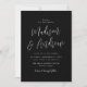 Convites de casamento minimalistas com seus nomes exibidos em um simples roteiro branco com seus detalhes de casamento mostrados abaixo em um fundo preto. O convite se inverte para um fundo negro sólido.
