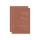 Simples, elegante e saboroso, este clássico design de convite de casamento Terthy apresenta uma fina linha de fronteira ao longo da margem esquerda com a inicial do monograma da noiva e noiva. Uma combinação de fontes serif elegantes de eterno emparelhada com uma fonte de script tradicional é usada para os nomes da noiva e do noivo e outro texto de sotaque. Você pode adicionar, remover ou ajustar o posicionamento do texto de acordo com as suas necessidades. O fundo de terracota, sempre popular, com textos esbranquiçados adiciona à simplicidade pura desta design e é uma escolha adorável para casamentos no outono ou meses mais frios. O verso do convite tem uma modelo de texto para incluir um código QR para fornecer aos seus convidados de casamento um método fácil de RSVP e para ver detalhes e planos em torno do casamento. Esses convites estão disponíveis em formatos de download digitais impressos e sem papel.