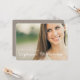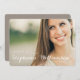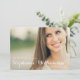 Um design moderno simples e bonito que caracterize a foto do seu formando na parte dianteira com todos os detalhes do partido ou do anúncio na parte traseira em um fundo marrom neutro macio. Design branco elegante da tipografia com uma sensação feminino em um formato horizontal. Uma maneira intemporal, clássica e bonita de destacar a celebração da graduação da sua filha.