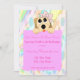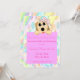 Cachorro feminino adorável com um sinal de 1º aniversário e convite em um fundo de bolhas de paisley