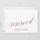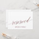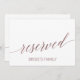 Este elegante cartão "reservado" em caligrafia dourada-rosada é perfeito para um casamento simples. O cartão é frente e verso (imprime dos dois lados). O design rosa-bege apresenta um cartão minimalista decorado com tipografia romântica e caprichosa em folha dourada-rosada falsa. Use esses cartões para reservar cadeiras ou mesas na cerimônia de casamento, recepção ou qualquer evento.
