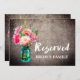 Este sinal de "reservado" de casamento com jarra de pedra e flores é perfeito para um casamento com tema floral country. O sinal é duplo lado (impressões em ambos os lados). O design apresenta um arranjo elegante de peônias e flores silvestres em aquarela rosa em uma jarra de pedra azul em um fundo texturizado de madeira. Use esses cartões para reservar cadeiras ou mesas na cerimônia ou recepção do seu casamento.