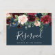 Indique o assento reservado no seu casamento com este símbolo floral de joia. Personalize com duas linhas de texto personalizado em script de caligrafia e em caracteres modernos de bloco (mostrados com "Reserved" e o nome do convidado com assento reservado), enquadrado por flores aquáticas e folhagem verde em tons ricos de outono, em um fundo azul marinho.