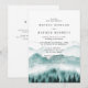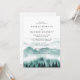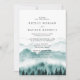 Convite de casamento elegante e rústico com montanha em aquarela com árvores e iniciais da noiva e do noivo no verso com informações do casamento.