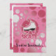 skate cor-de-rosa divertido é excelente para uma garota que adora esportes e festas de patinação divertida! Círculos de bolhas cor-de-rosa e espirros ao fundo com um skate rolo branco e cinza com rodas e cadarços cor-de-rosa. Excelente para a festa de aniversário de patinação de uma garota ou qualquer ocasião!