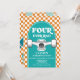 Quatro Nunca! O Vamos do skate Kick It, o convite para o quarto aniversário com cheque laranja e skate azul.