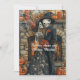Casamento de Halloween com um lindo casal de esqueleto vestido com suas melhores roupas. Noiva veste um vestido preto com imagens de crânios e tem abóboras no cabelo. O noivo veste um terno preto e um chapéu pontiagudo. Há aranhas pretas grandes rastejando por aí enquanto um Bat pendura do manto. Convite de casamento de gótico que pode ser personalizado para atender às suas necessidades.