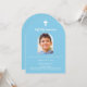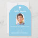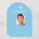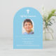 Um fundo azul-céu, decorado com uma cruz branca Personalize e adicione um nome de foto e detalhes. Texto branco. Quadro fotográfico em forma de arco.