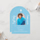 Um fundo azul-céu, decorado com uma cruz branca Personalize e adicione um nome de foto e detalhes. Texto branco. Quadro fotográfico em forma de arco.