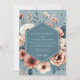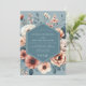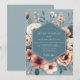 An elegant and artistic composition features a lush arrangement of blossoms against a serene, dusty blue backdrop. Soft, painterly flowers in shades of warm coral, delicate peach, and creamy ivory create a stunning, romantic contrast. Beautifully rendered anemones and roses are nestled amongst sprays of delicate greenery, evoking a timeless appeal for your nuptials.
