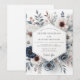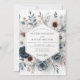 The mood is romantic, elegant, and slightly moody. The color palette is dominated by dusty slate blue, deep navy, and touches of muted rust, contrasted with soft white blossoms. The artistic style is soft and painterly, featuring a beautiful arrangement of white anemones, dusty blue roses, and delicate gray-green foliage. This composition evokes an ethereal and sophisticated atmosphere.