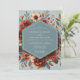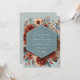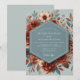 A sophisticated arrangement of painterly botanicals sets a romantic tone. Lush zinnias and anemones in warm terracotta and paprika hues bloom vibrantly against a moody slate blue setting. Touches of muted teal foliage complete this artistic composition, perfect for an elegant autumnal affair.