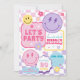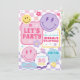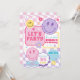Fun pastels smiley faces invitation! A fun retro trendy theme, features pink shades, pastel blue, purple, yellow, flowers, lightning bolt, stars and checkered pattern.