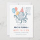 Sob o tema Mar, convite de aniversário apresenta um polvo fofo com balões e chapéu de festa. Perfeito para náutica, costeira, "Sob o Mar" e praias celebrações temáticas e as cores de verão do azul de praia, do coral, do marinho e do amarelo ensolarado são excelentes para uma menina ou um menino. O lado inverso é o padrão da bolinhas. Arte por KL Stock