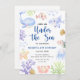 Um belo animal submarino temido Aniversário convite com animais marinhos de cor aquática - baleia, medusa, peixe-palha, caranguejo, tubarão e corais. Bolhas de água e conchas.