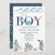 Crie o anúncio perfeito do bebê + convite do chá de fraldas com este moderno sob o tema do mar design, com uma mão pintada de baleia, coral, e animais oceânicos decorando a palavra 'menino'. A parte de trás da carta apresenta uma ilustração do tema do oceano submarino. Copyright Elegant Invites, todos os direitos reservados.