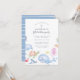 Esta design moderna apresenta uma tipografia de na moda, enquadrada por lindos animais oceânicos a aquarelas. Há uma água-viva, um golfinho, uma tartaruga, um caranguejo, uma arraia, uma baleia, um polvo, um cavalo marinho, dois peixes e bolhas azuis. O verso deste convite tem um fundo azul-marinho com listras brancas bonitas. Exibir o link de coleta nesta página para produtos correspondentes.