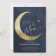 Um doce convite para o chá do bebê do Céu da Lua, que apresenta uma ilustração aquática de uma lua crescente móvel sobre um fundo marinho azul-aquarela profundo, com efeitos dourados sobre a lua e as estrelas ( note que estes são efeitos digitais, não uma folha real!). Perfeito para futuros pais que amam o tema da lua, a lua, as estrelas e os temas celestes.