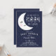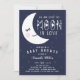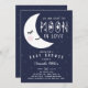 Adorável menino sobre a lua em convite para chás de fraldas. Sacudir nosso chá de fraldas convidar para ver uma coordenação com estrelas azuis.