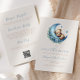 Este belo convite para o chá de fraldas apresenta um doce ursinho-d'água dormindo em uma lua azul crescente decorada com flores azuis, acima das palavras "sobre a lua" em roteiro azul de escrita manual. Personalize o texto com o nome da futura mãe no script e os detalhes na fonte sans serif em um fundo bege. O verso oferece espaço para fralda, livros para bebê e detalhes do registro, juntamente com um conveniente código QR que os convidados podem digitalizar para visitar o registro. Ideal para o chá de fraldas de um menino.