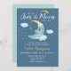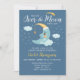 Um marinho adorável e um convite à chá de fraldas da lua azul com uma lua bonita com nuvens, estrelas e o ditado "Estamos sobre a lua com alegria." Sacudir nosso convite para ver um padrão de estrelas azul e branca para um toque especial extra. Projetado para você pelo Blackberry Boulevard.