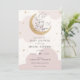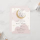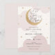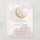 Chá de fraldas com nuvens cor-de-água rosa e estrelas douradas com lua reluzente e roteiro divertido "Estamos sobre a lua!" Personalize com suas informações ou clique em "clique para personalizar mais" para ajustar o tipo de fonte, o tamanho e a cor.