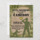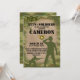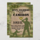 Este convite de festas personalizado apresenta um tema de missão militar. Imagens de soldados de brinquedos do exército verde são impressas no fundo, com uma em um paraquedas no topo. Um padrão camuflado borda as imagens.