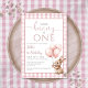 This charming 1st birthday party invitation features a cute little baby bunny holding balloons, and a pink gingham background. Designed by Thisisnotme©