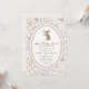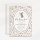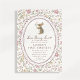 Floral bunny first birthday invitation featuring a sweet watercolor rabbit holding a flower, framed inside a scalloped oval border. The soft cream background and delicate floral pattern in blush, sage green, and muted pastels create a charming cottagecore and storybook-inspired look.