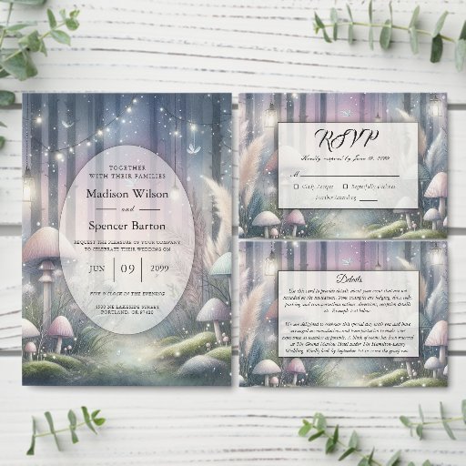 Convide seus convidados para uma noite mágica debaixo de lanternas brilhantes com este sonhador design de convite para casamento. Colocada em uma floresta pastel cheia de cogumelos levemente iluminados, borboletas fluindo e luzes cintilantes, essa cena encantadora é perfeita para um cheio romântico de maravilha. Matizes de blush, lavanda e talho suave criam uma atmosfera de conto de fadas para o seu momento mais inesquecível.