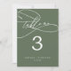 Este refinado número da mesa de casamento verde da Coleção Sophia apresenta caligrafia varrida em branco nítido. Elegante, mas ao ar livre — é ideal para jardins, vinhedos ou casamentos florestais com um sentimento natural e romântico. A placa impressão na frente e atrás (lado duplo). Adicione cada número de tabela que você precisa ao seu carrinho individualmente.