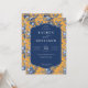This wedding invitation features a vintage-inspired design with a balanced, vertical layout centered around a navy-blue rectangle framed by intricate blue floral patterns on a mustard-yellow background. The color palette combines deep navy and lighter blue hues against the warm yellow, creating an elegant and striking visual impact. The typography includes a mix of serif and script fonts, adding a formal yet inviting tone to the overall sophisticated and celebratory mood. Perfect for couples seeking a timeless and romantic aesthetic, this invitation is ideal for commemorating their special day with style and charm.