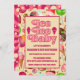 O primeiro convite de aniversário divertido apresenta ilustrações de sorvete de aquarela, texto esboçado manualmente e cores brilhantes. A parte de trás tem um padrão de pontos cor-de-rosa e branco que lembra o sorvete parlor