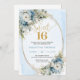 Celebrate a milestone moment with this elegant Sweet Sixteen invitation, featuring a refined watercolor design of dusty blue florals blended with soft white flowers and fresh eucalyptus greenery. Framed by a shimmering gold glitter border and paired with graceful script lettering, this invitation sets a sophisticated tone for a truly unforgettable Sweet Sixteen, Sweet 16th, or 16th birthday celebration.