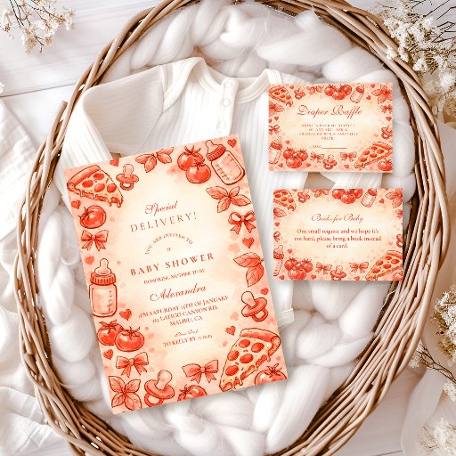 Celebrate the upcoming arrival with a playful Special Delivery baby shower design inspired by everyone’s favorite comfort food. This whimsical illustration features hand-drawn pizza slices, baby bottles, bows, and hearts in a warm tomato-red palette, arranged in a charming storybook-style frame. Perfect for parents who love fun, food-themed celebrations with a cozy, modern twist. Easily personalize all text to create a memorable invite that feels joyful, unexpected, and full of personality.