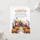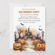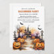 Um convite para o Halloween, com uma mansão assombrada, jack-o-lanternas, morcegos e uma bruxa.