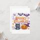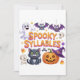 A festive Halloween-themed illustration featuring the phrase "SPOOKY SYLLABLES" in large, orange and purple gradient letters. Surrounding the text are various cartoon characters and objects: a cheerful white ghost, two hanging happy bats, an adorable black cat, a smiling jack-o'-lantern with a carved face and a purple witch hat on top, skulls, bones, and candy corn pieces. The background is dark with scattered star sparkles.