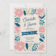 The design uses a vibrant yet soft pastel palette, leaning into a spring or summer garden theme. It is framed by a playful border of stylized, multi-colored petals and leaves in shades of teal, coral, and soft pink.