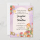 A soft and romantic wedding invitation featuring colorful tulips and elegant gold wedding rings on a gentle pink watercolor background with an arched design in the center.